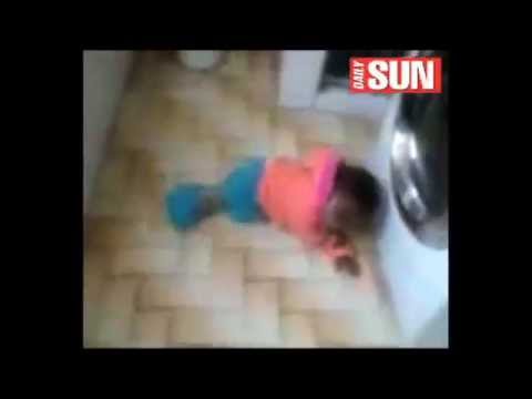 In the video, the child tries to free herself by moving around on the floor until she gets stuck between the toilet and the wall.